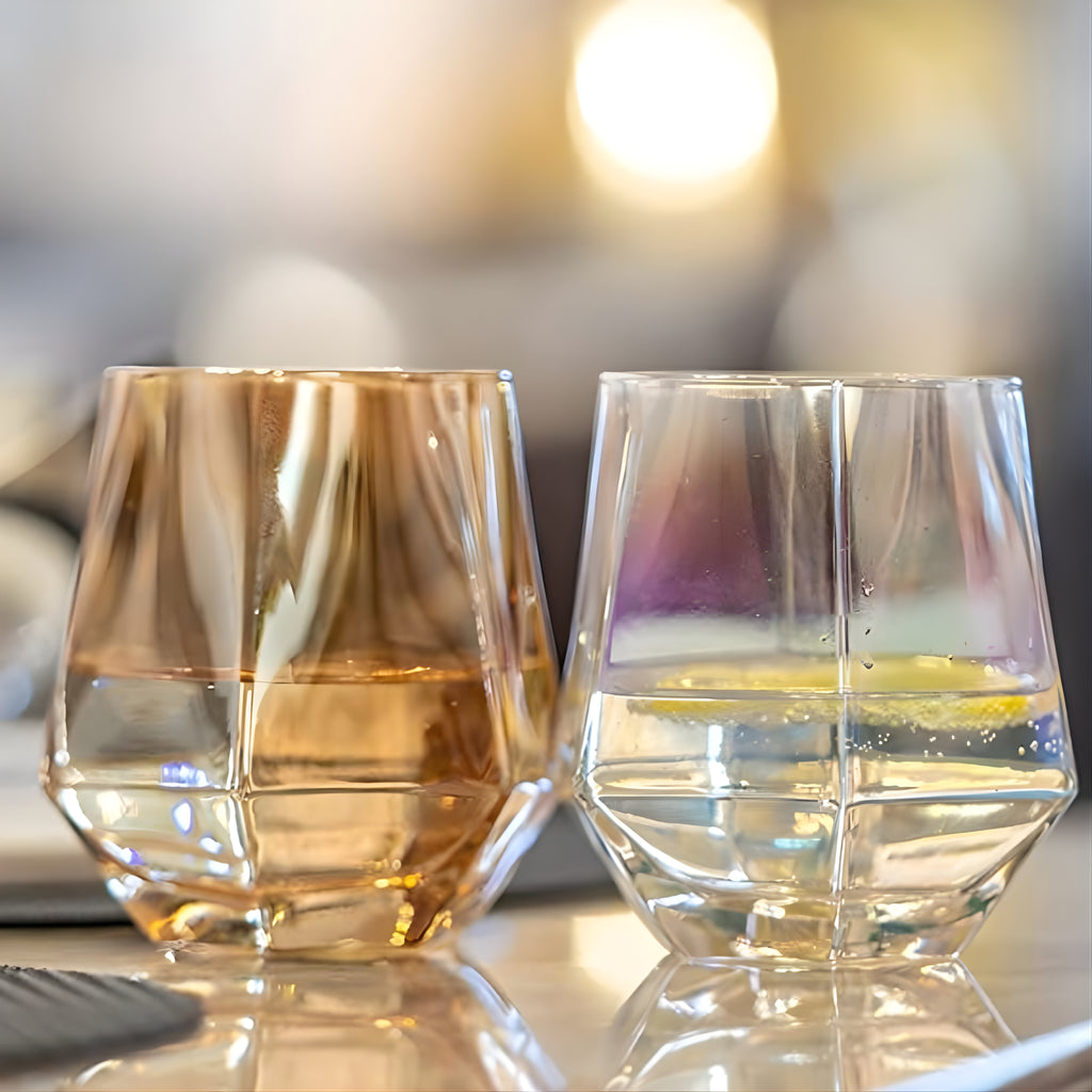 HIGH QULITY DIAMOND WHISKEY WINE GLASSES: Old fashion glass set is made of transparent and shiny lead-free crystal glass. Lightweight double-layer unique diamond design. Resistant to fracture and scratches. Unlike ordinary bourbon whiskey glasses, diamonds are inspired by the rims with golden rims, which are beautiful and clear. When you pour into a rock glass and rotate it in the glass, let it inflate. Very suitable for whiskey, bourbon, scotch, wine, etc. Easy to clean. The wonderful diamond six-sided cup reflects wonderful visual enjoyment. You can make the table or any bar look very beautiful, elegant and perfect, and make you and your guests impressed with every drink.